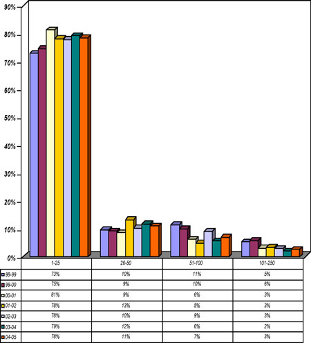 In the report's special section on tuition costs and finances, Trent received top marks for providing student financial aid. The report noted that Trent "…provides some 3,000 bursaries ranging from $1,000 to $2,500 each year, distributing a total of $2.5 million a year in addition to nearly $2 million in scholarships. This year, for example, two freshmen students won Trent's Champlain Scholarships of $8,500 in 2005-06 and $3,000 for each of the next three years, provided they maintain averages of 80 per cent or more." The University also scored impressive rankings in a number of categories including: