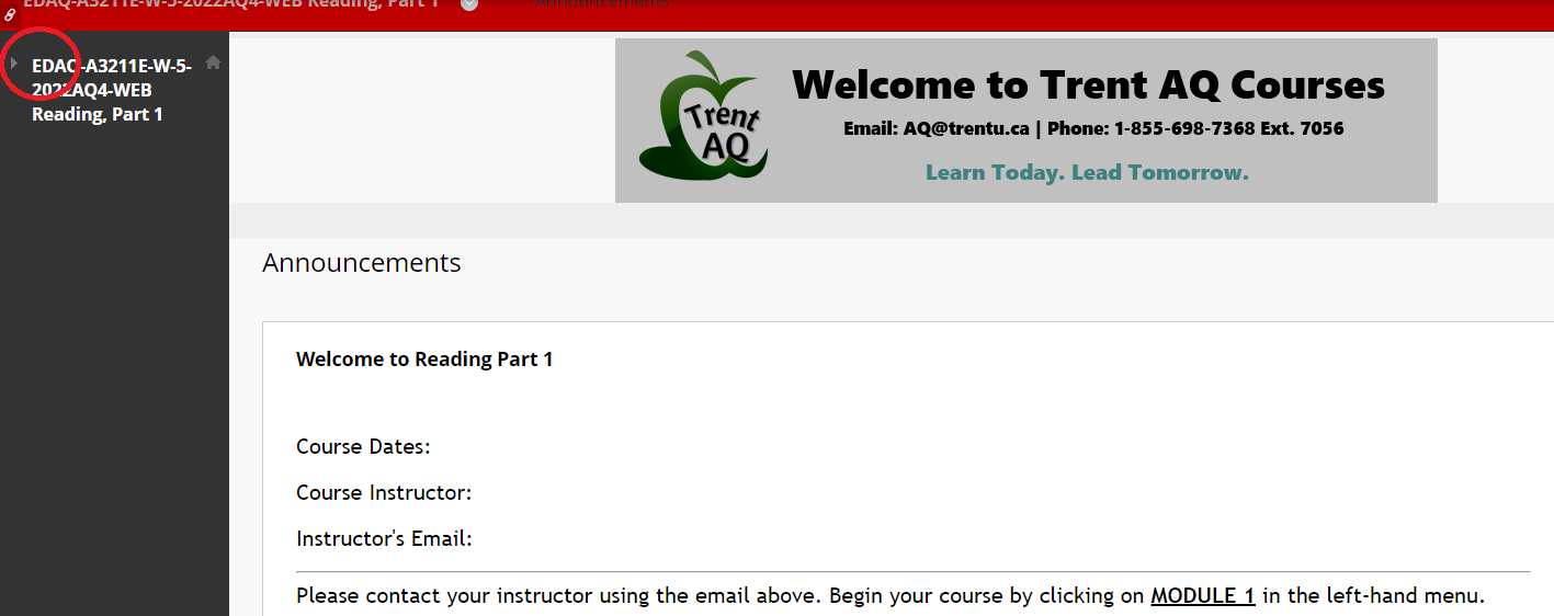 - The course menu on Blackboard can be hidden, which will hide the links to your course material. To make it visible again, point your cursor towards the left edge of the page. A thin bar with an arrow will appear. Click on it to access the course menu. If the course menu is minimized, click on the small arrow next to the course name on the left hand side.