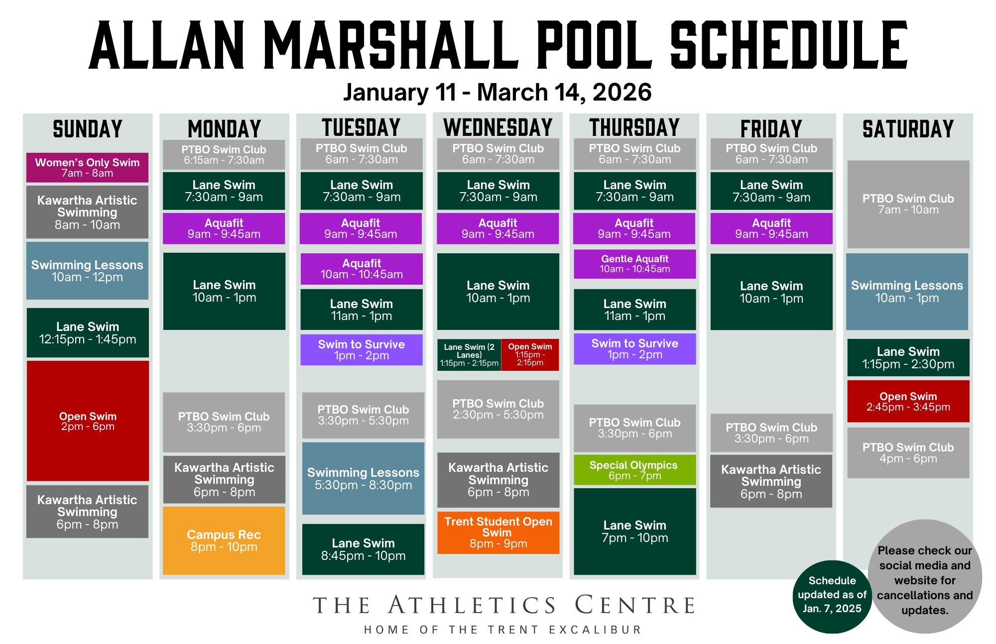 Whether you're gliding through lane swims, splashing around in open swims, or powering up in Aquafit, there's a spot in the pool just for you! All Trent students and members are welcome—or grab a day pass and make a splash!