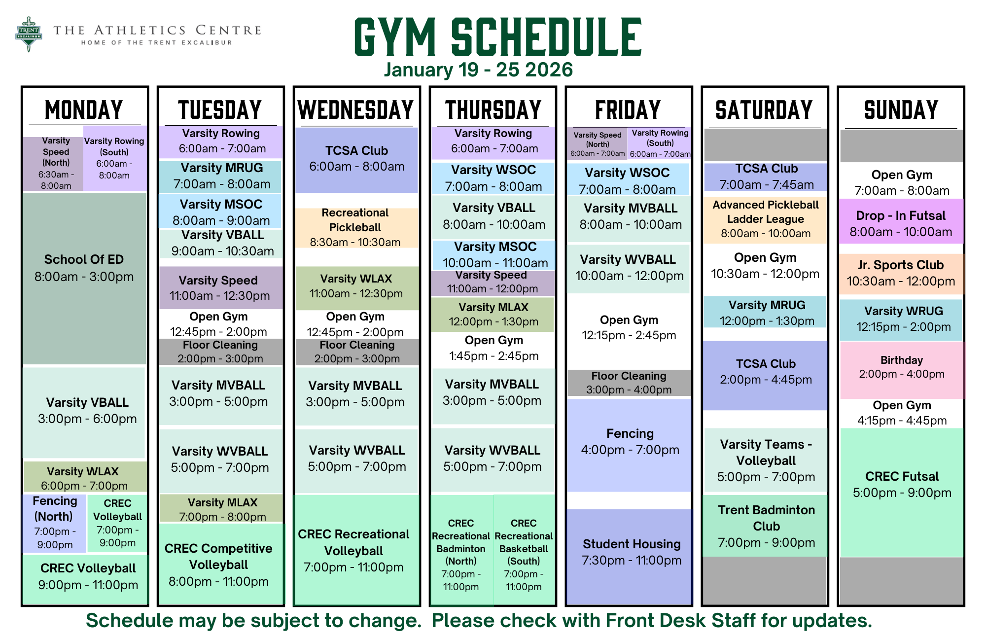 Drop-In Gym Schedule January 19 - 25, 2026