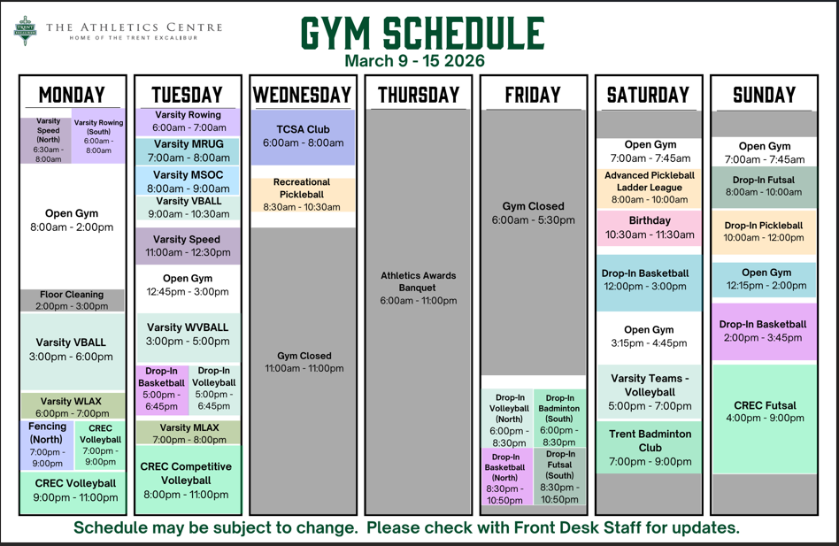 Check the weekly gym schedule to see what’s happening and plan your visit. Please note that this schedule will change weekly.