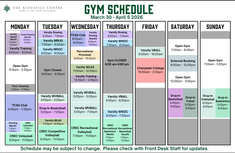 Check the weekly gym schedule to see what’s happening and plan your visit. Please note that this schedule will change weekly.
