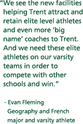 Outside of the campaign, the contribution of past, present and future Trent students is also a significant piece of support for the TCSRC. In October 2004 students voted to establish a new $50 annual fee ($300,000 per year) in support of capital improvements to the athletics and recreation facilities at the University. Over the past six years, full-time undergraduate students have contributed more than $1.8 million to the new TCSRC.
