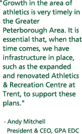 As the only fitness and recreation facility in the growing north end of the City of Peterborough, the Trent Community Sport & Recreation Centre provides vital wellness services to all residents. Unique and innovative features of the new Athletics Centre, which opened in September 2010, include: North America’s most advanced indoor combination rowing/paddling tank, an indoor climbing wall, 12,000 sq. ft. cardio loft and weight room, warm therapy pool, expanded therapy clinic, and a complete makeover of the pool. The new Athletics Centre is complemented by outstanding outdoor facilities, including the Justin Chiu Stadium which features an artificial grass playing field, 405-metre track and stadium seating for 1,000 people. Community memberships at the TCSRC are available. Visit