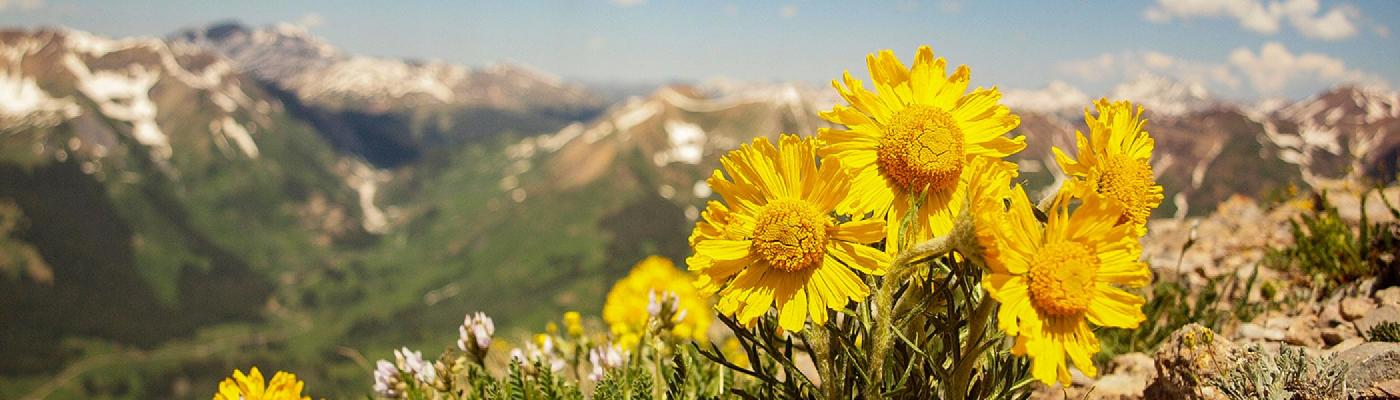 Alpine sunflowers growing on rocks overlooking a mountain range