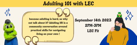 Lady Eaton College presents: Adulting 101! Adulting is hard, so why not talk about it? Adulting 101 is a community conversation around practical skills for navigating living on your own.
