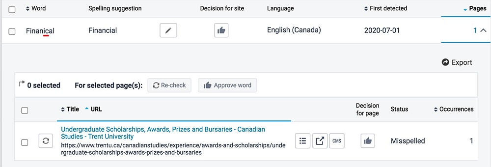 If the flagged word is not actually misspelt, you can click the "thumb's up" icon, that would approve the word for the whole site and move the word to the "Approved Words" panel. Click the number under "Pages" and you can see where the misspelling is, and you can click the "CMS" logo to go straight to the edit page if you are already logged in to Drupal.