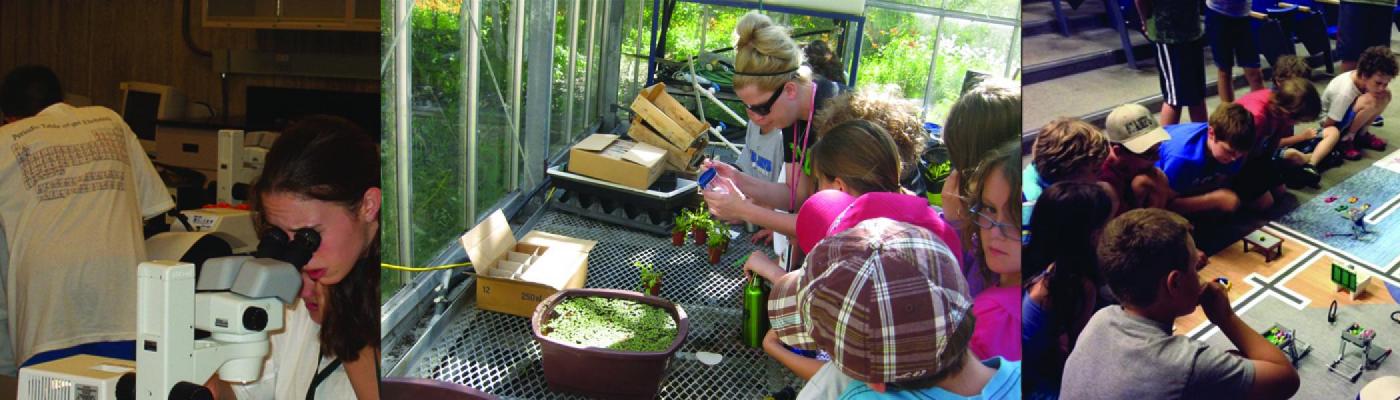 A teen using a microscope, a teacher planting, and a group of children playing a game