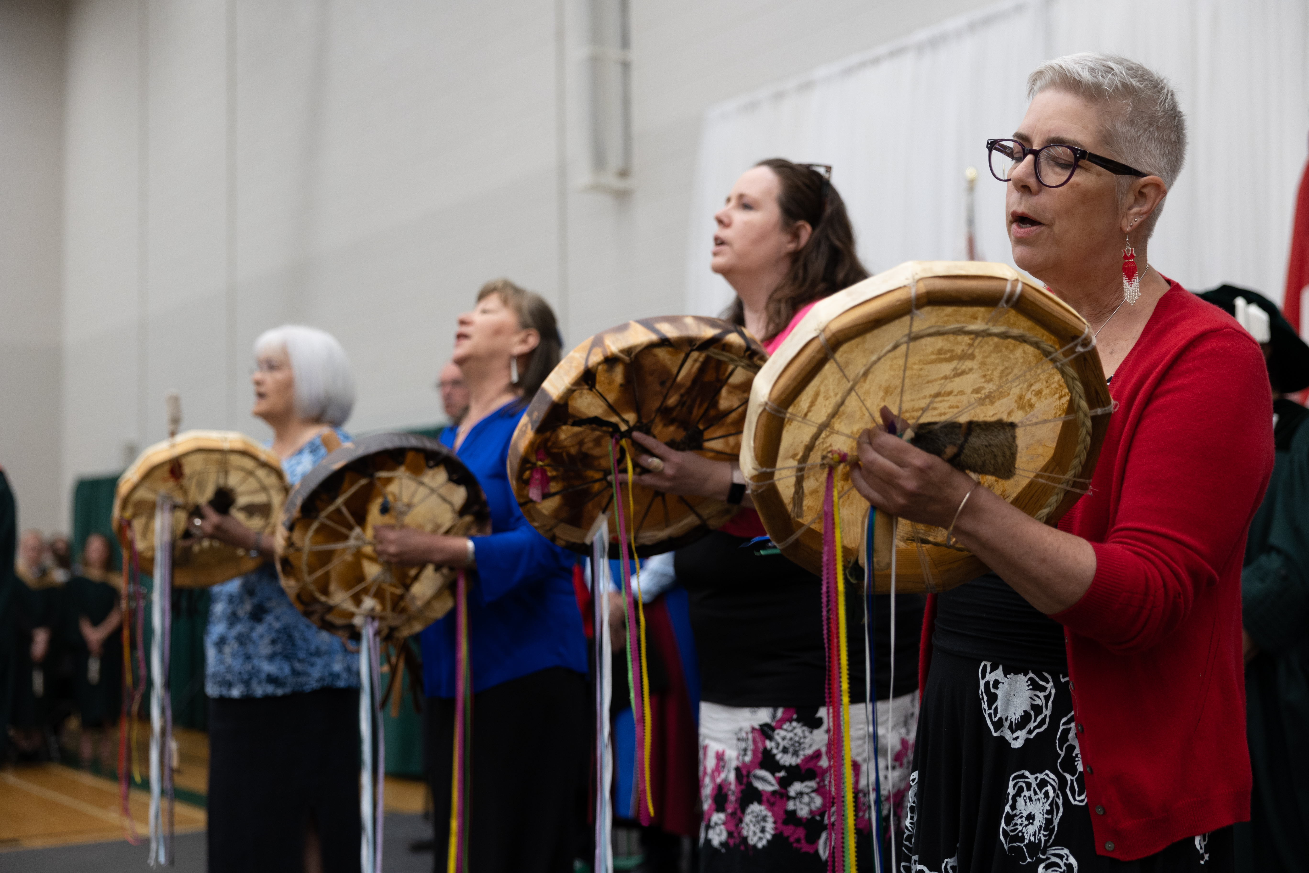 Trent honours the Indigenous tradition of an honour song performed for the graduating class upon the conclusion of the awarding of degrees and diplomas. This song is performed by Unity, a four-woman Indigenous a cappella group formed in Peterborough in 2006 by Joeann Argue ‘98, Brenda Maracle-O’Toole ‘77, Barb Rivett and Heather Shpuniarsky ’00.