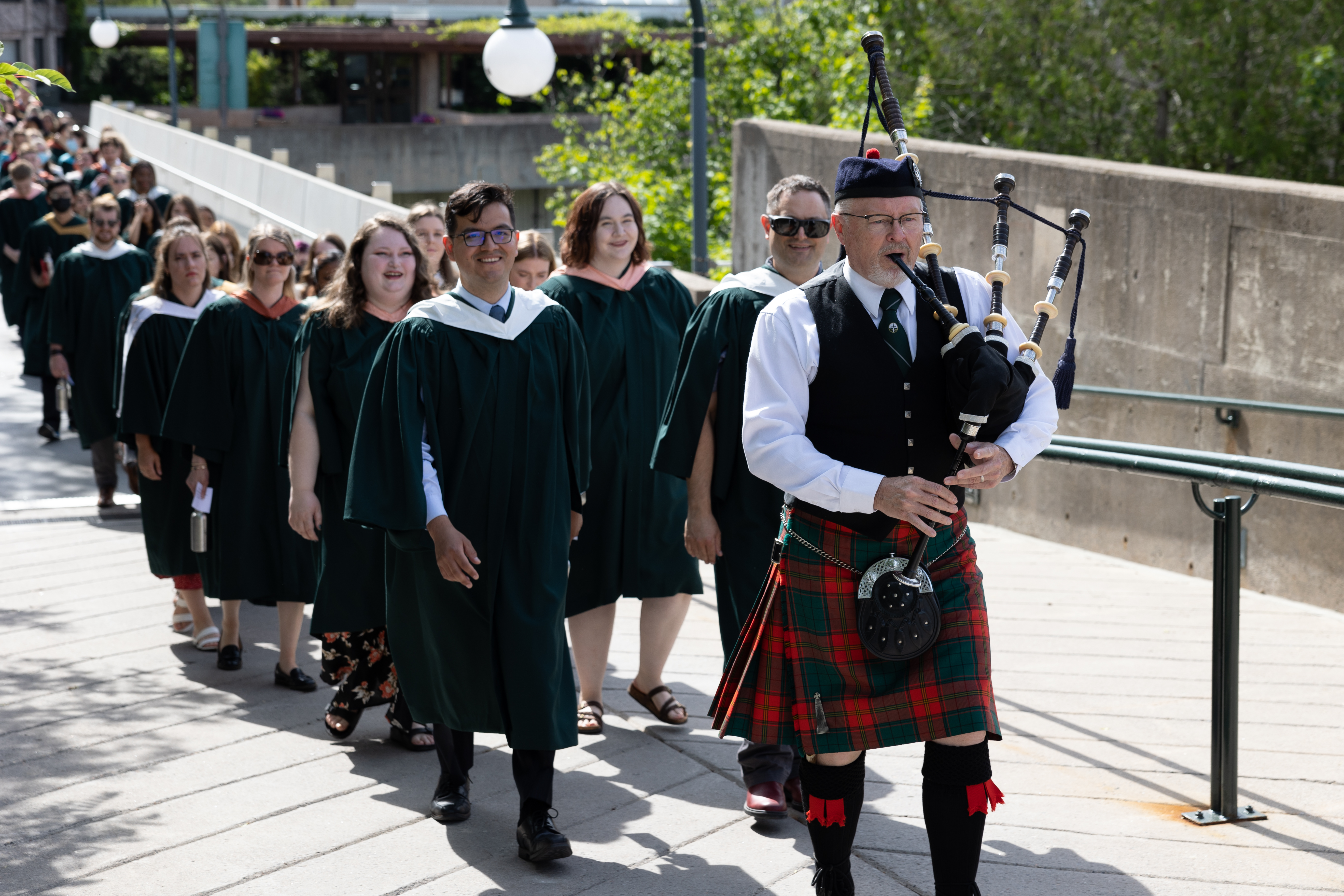 Graduands (students about to graduate) are lined up by degree and alphabetically. Dressed in Trent’s traditional regalia, led by Trent's Eagle Feather, Eagle Staff Carriers, the Water Bearer, and bagpiper, the procession makes its way past the audience filled with family and friends to the stage.