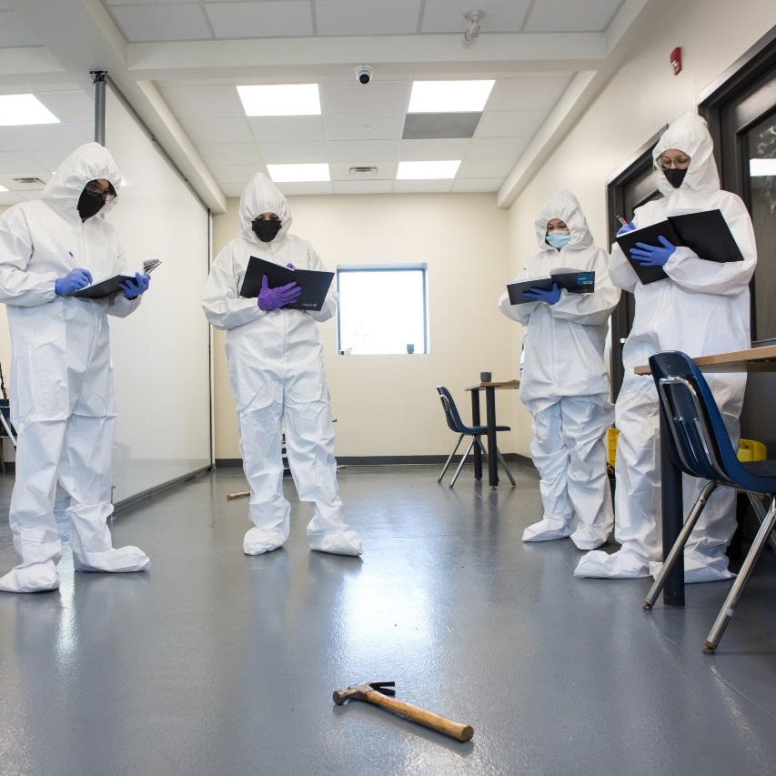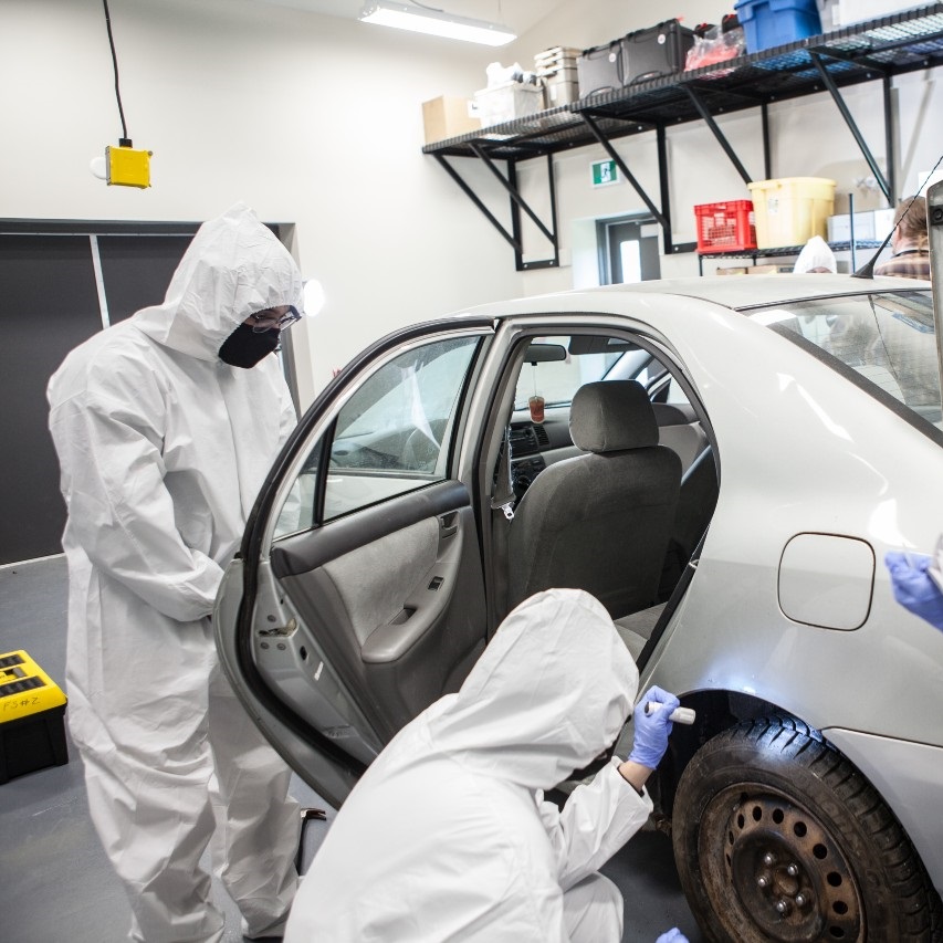 A group of forensics students working on a car while being guided by their instructor