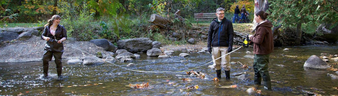 2 Students standing in the Otonabee river taking river samples in the spring time with Professor Paul Frost