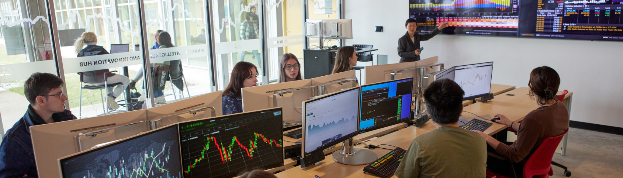 Lecture in Financial Intelligence & Innovation Hub, with students on computers looking at data.