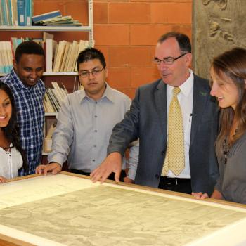professor and 4 students standing around geographical map