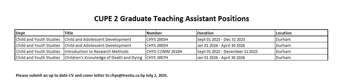 Please direct all questions related to the hiring of Graduate Teaching Assistants to the School of Graduate Studies at gradta@trentu.ca.