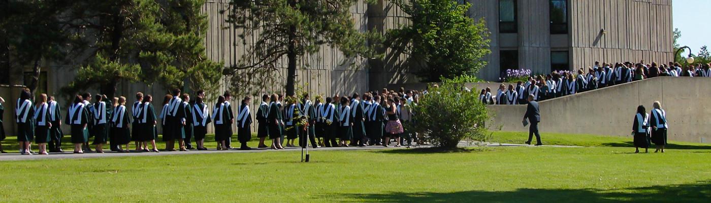 A long line of history graduates waling past Lady Eaton College in their convocation gowns