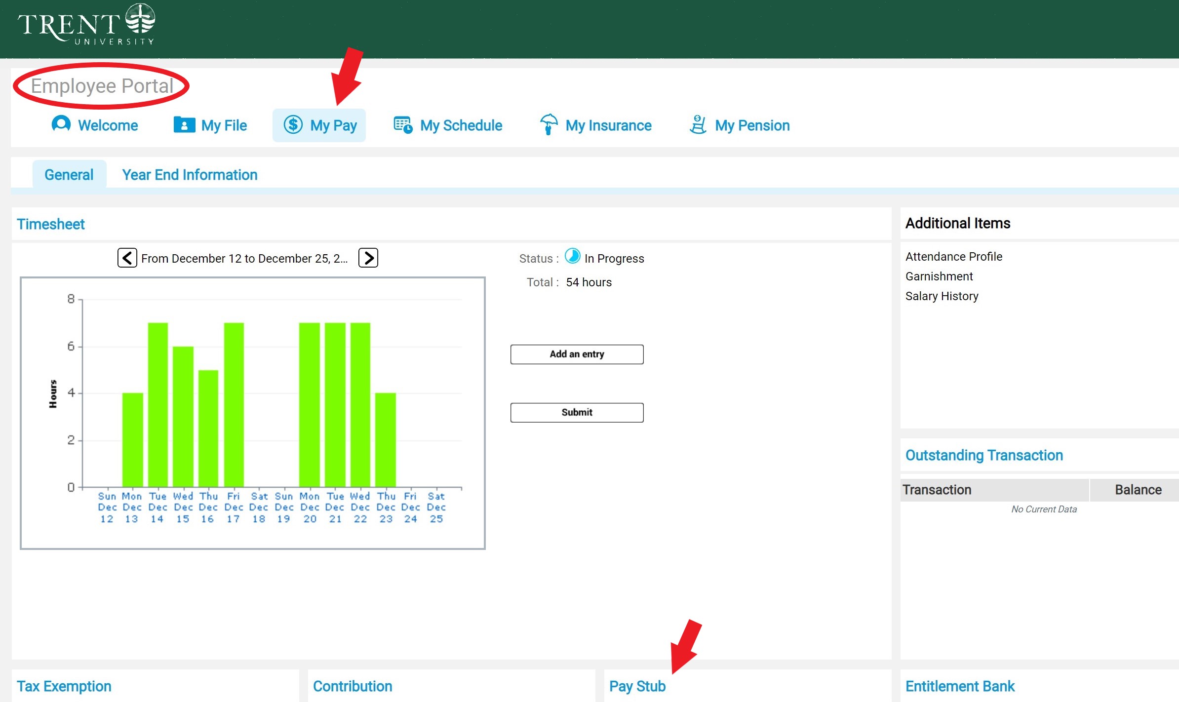 If you notice any discrepancies in the information, have any questions or experience any trouble accessing your paystub, please reach out to HR by email at humanresources@trentu.ca or call extension 1460 during regular office hours, Monday to Friday 8:30 am – 4:30 pm.