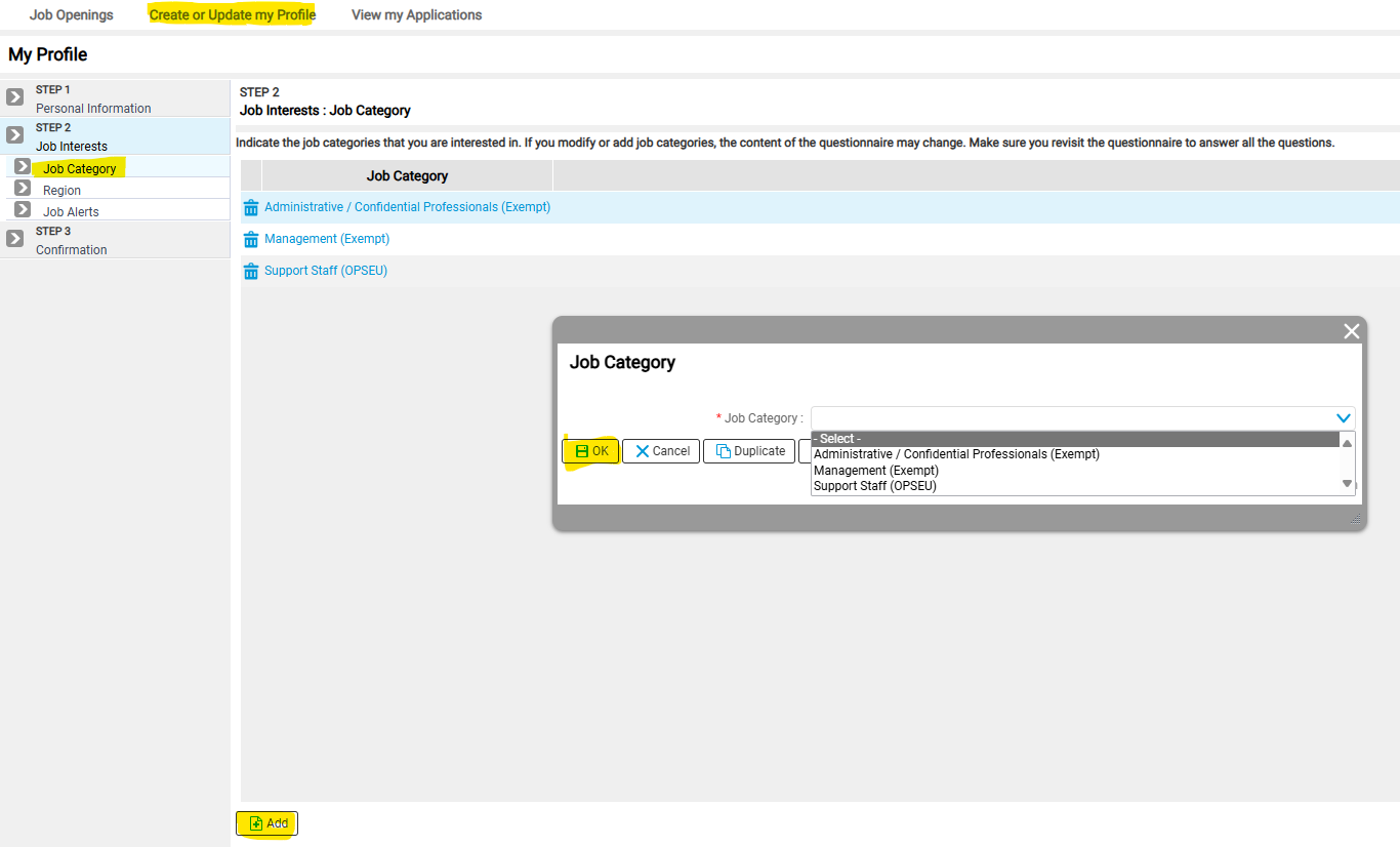 4. Select at least one [1] Job Category you are interested in receiving alerts for by selecting "Add" then choosing a job category from the drop down list and selecting "OK". Repeat this process if you wish to select multiple job categories.