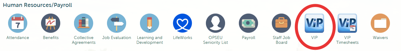 VIP is Trent University's Human Resources Information System. To check to see if you have access to VIP, login to your myTrent account, select "Support" and scroll to the "Human Resources/Payroll" section. If you have VIP access you will see this icon:
