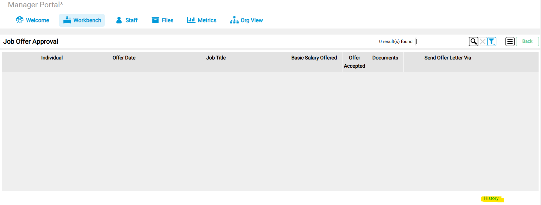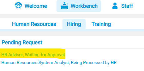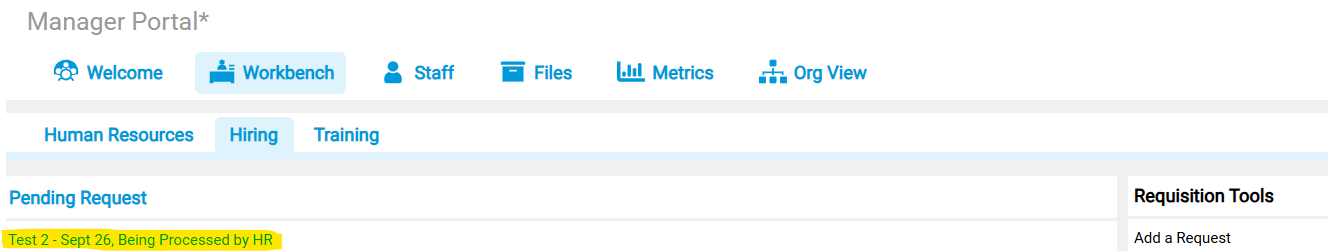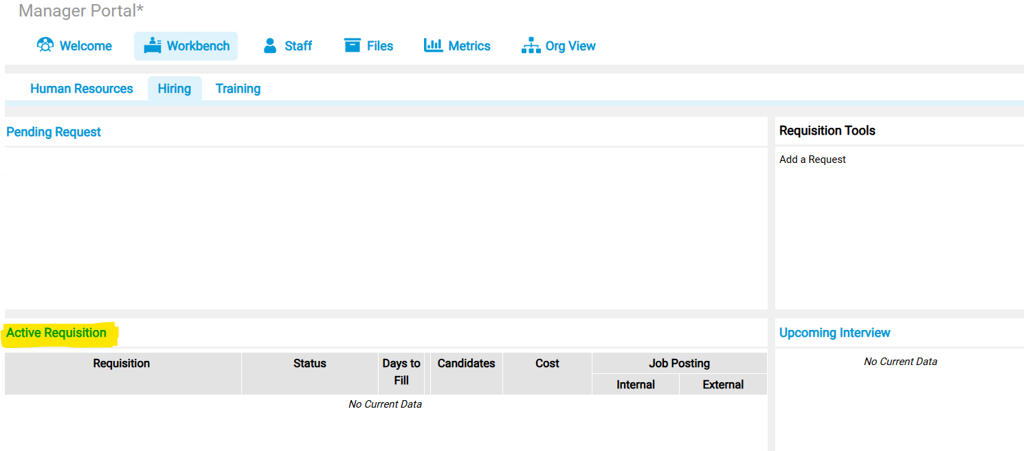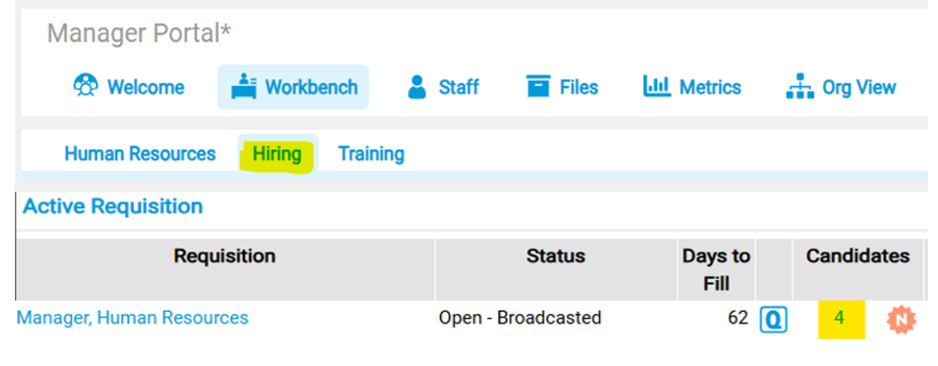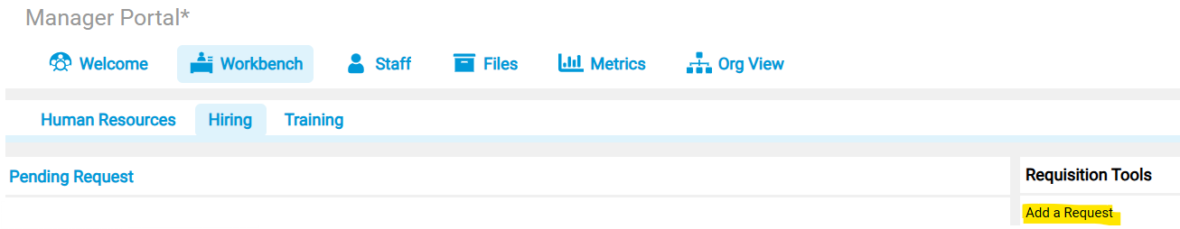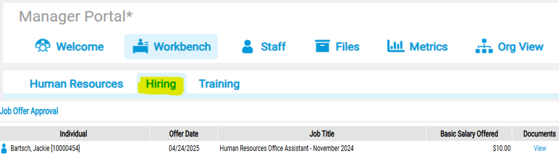 - Navigate to the Manager Portal > Workbench > Hiring.