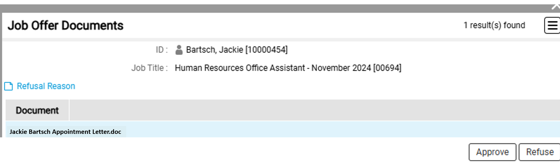 - Select "Approve" then "Ok" and the candidate will receive an email with the offer letter attached. Or, if the appointment letter needs to be revised, you can enter the "Refusal Reason" and then select "Refuse" and Human Resources will revise and resend with the required edits.