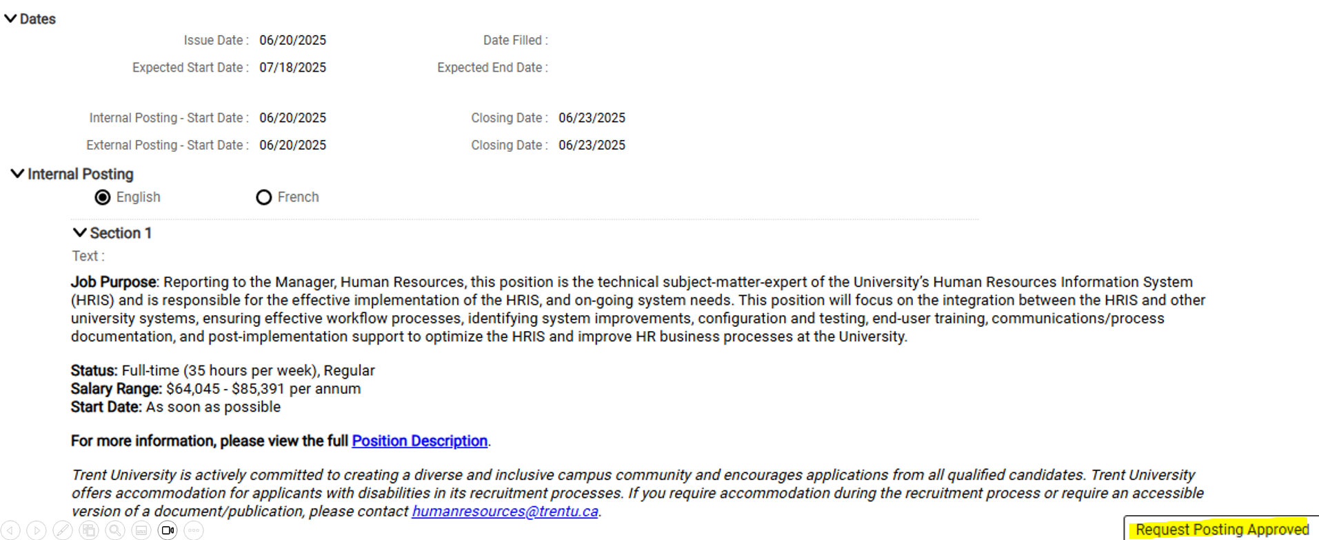 - You will notice both an internal posting and external posting, you only need to review the internal posting details as that information is automatically duplicated for the external posting. Ensure the following details are accurate: job title, status, closing date, salary range, etc..