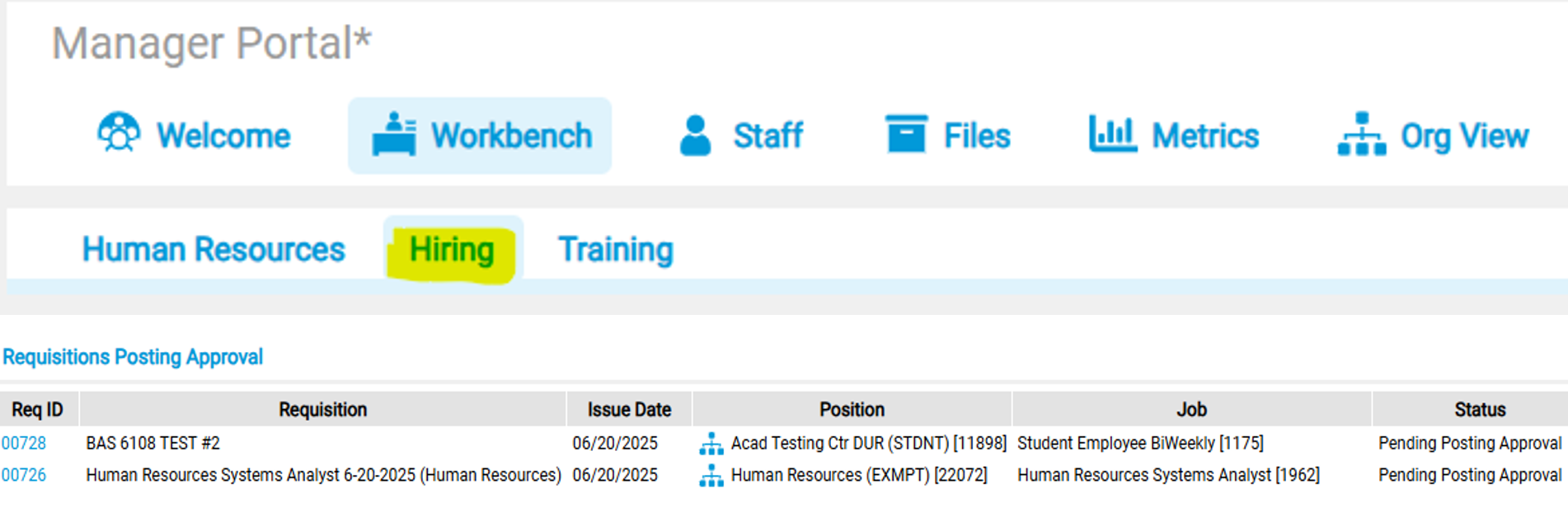- Navigate to the Manager Portal > Workbench > Hiring. Scroll down to “Requisitions Posting Approval” and select the job posting you wish to review.