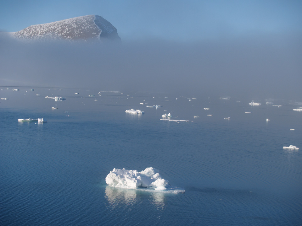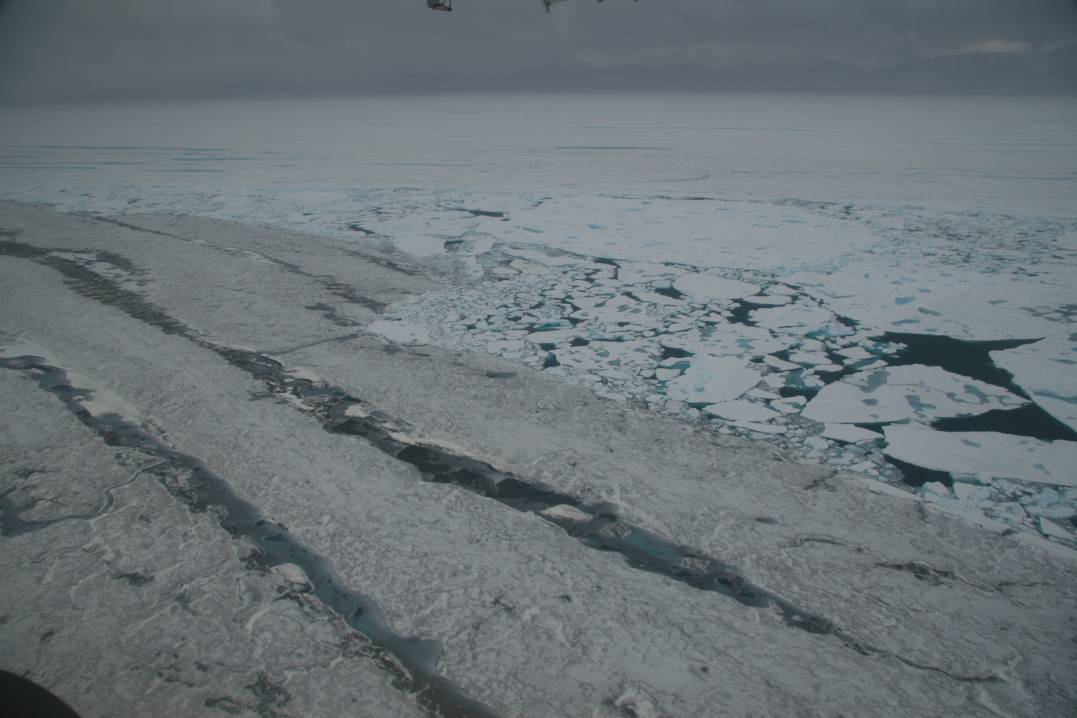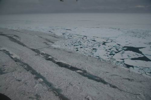 12) One of several ice islands that formed when the Markham Ice Shelf disintegrated. This ice island is 3.8 km long by 1.5 km wide. Photo courtesy of Warwick Vincent, Laval University.