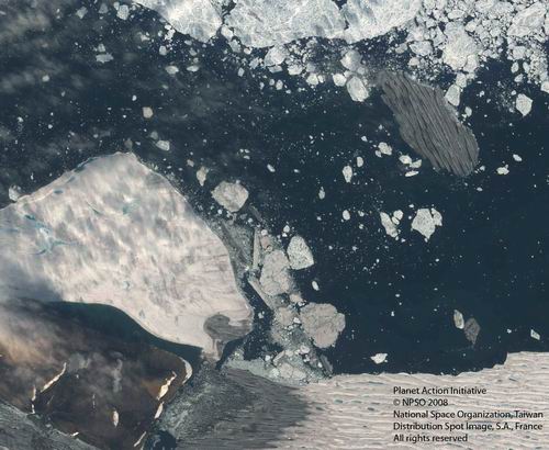 13) The ice island pictured above as it drifts westward past the Ward Hunt Ice Shelf. Formosat-2 image courtesy of Pax Arctica and the Planet Action Initiative, © NSPO 2008 - National Space Organization, Taiwan, Distribution Spot Image S.A., France, All rights reserved.