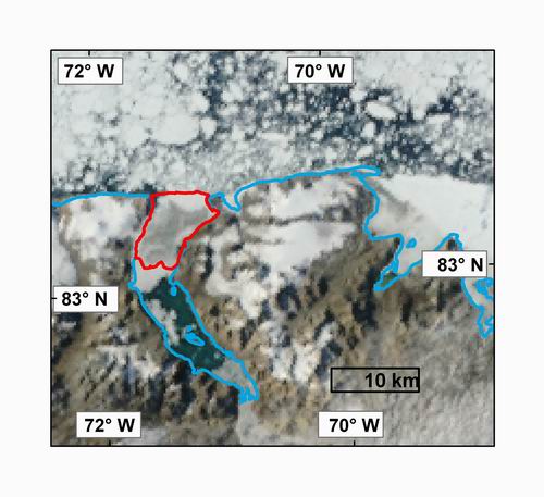 3) A MODIS image of the Markham Ice Shelf (2006 extent outlined in red) on August 6, 2008 starting to disintegrate. MODIS image from the Rapid Response Project at NASA/GSFC. Map courtesy Derek Mueller, Trent University.