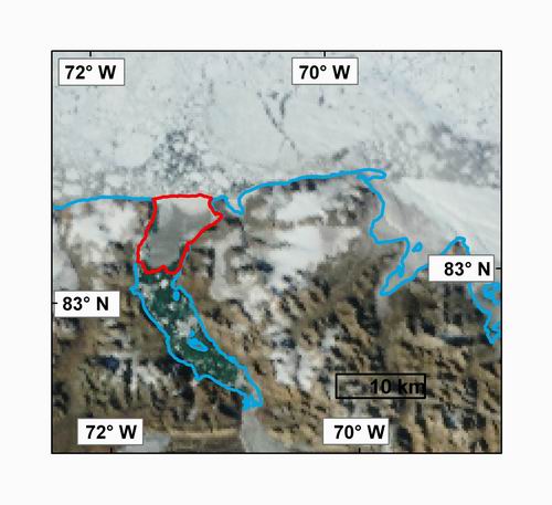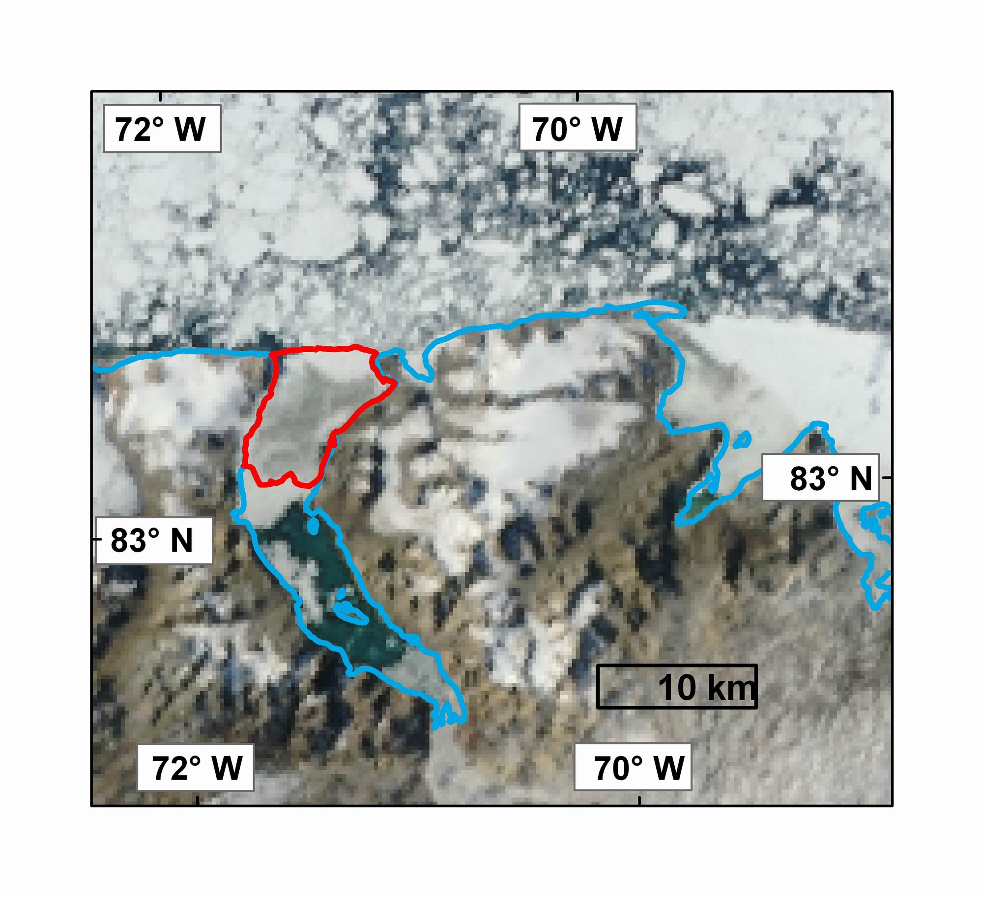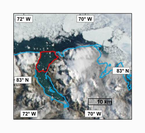 4) A MODIS image of Markham Fiord on August 12, 2008 following the loss of the Markham Ice Shelf (2006 extent outlined in red). MODIS image from the Rapid Response Project at NASA/GSFC. Map courtesy Derek Mueller, Trent University.