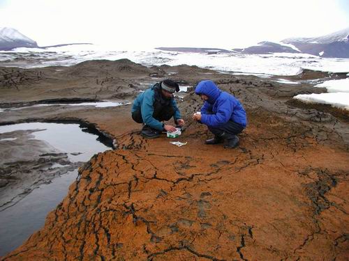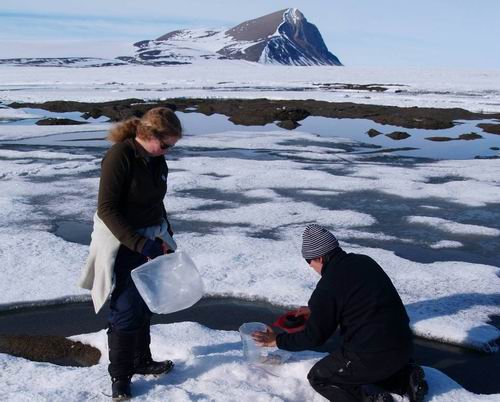 10) Scientists sample microbial communities that live on the surface of the Markham Ice Shelf in July 2007. The ecology of the Markham Ice Shelf is part of an International Polar Year Project (www.cen.ulaval.ca/merge/). Photo courtesy of Warwick Vincent, Laval University.