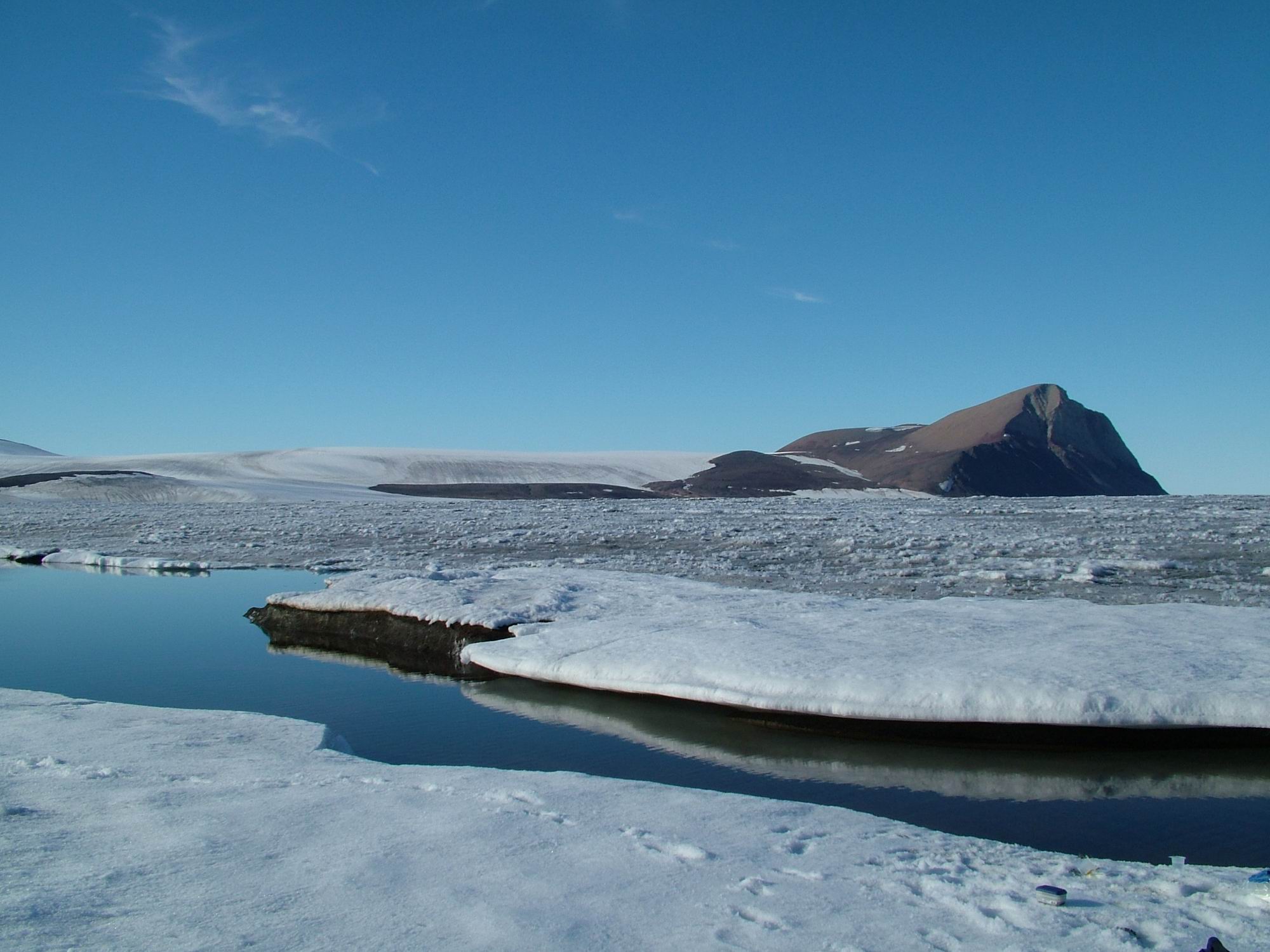 6) A melt water lake on the surface of the Markham Ice Shelf with Cape Nares in the background (August 2005). Photo courtesy of Denis Sarrazin, Laval University.