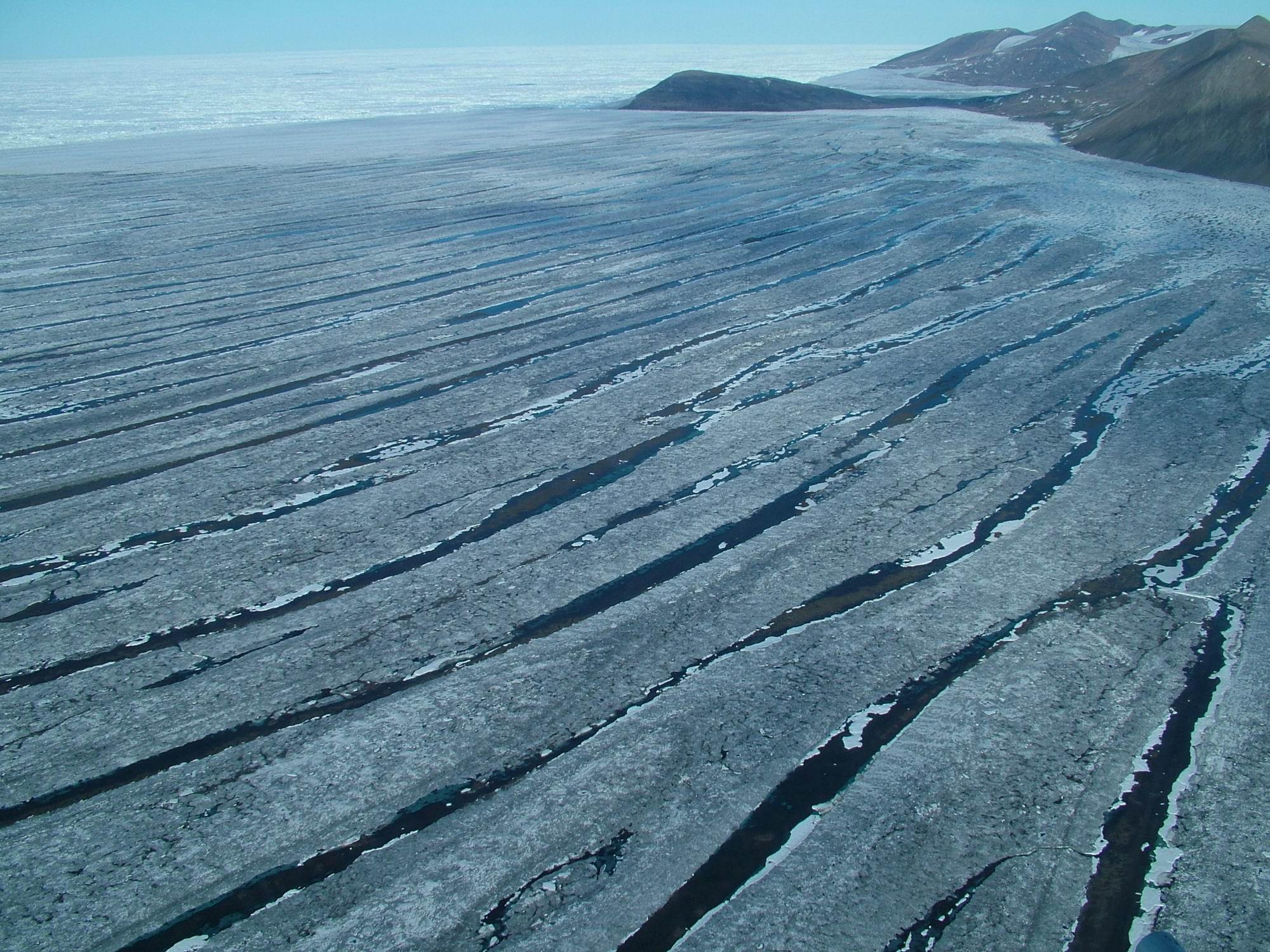 7) Long melt water lakes which contain microbial life on the Markham Ice Shelf viewed from a helicopter in August 2005. Photo courtesy of Denis Sarrazin, Laval University.
