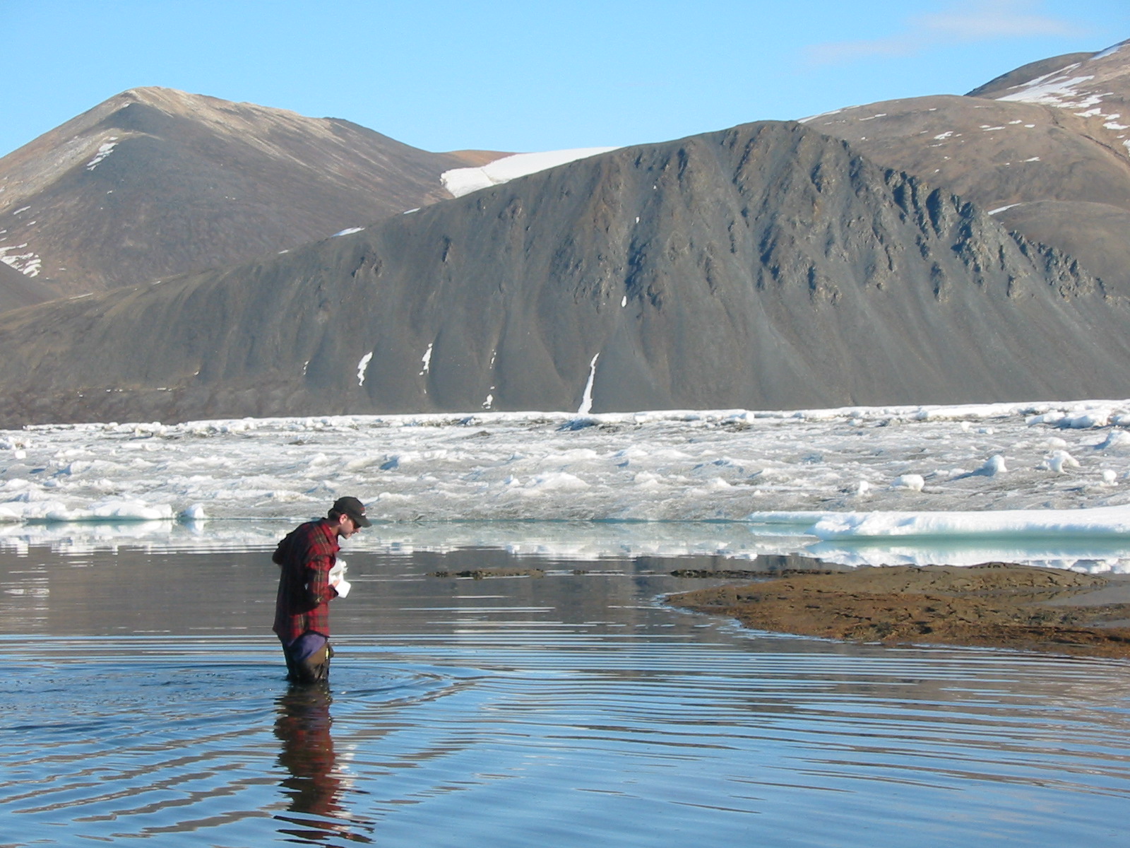 5) Dr. Derek Mueller walks into a shallow meltwater lake to sample the microbial communities that inhabited the surface of the Markham Ice Shelf in July 2002.