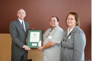 Accepting the honour on behalf of Mr. and Mrs. Benedict was their son and his wife, Daniel and Maureen Benedict. “We’re happy, honoured and thrilled,” explained Daniel, who travelled from Akwesasne to take part in the ceremony. Trent University vice president of administration, Don O’Leary, presented the family members with a special plaque announcing the new name of the room as the Benedict Gathering Space, “Ska’nikón:ra”, which translates from the Mohawk language into “gathering our minds together”.