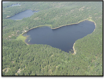 The photograph below, right shows an aerial view of Lake 222.  This is a small lake with a surface area of about 16.5 hectares and a maximum depth of approximately 6 meters. The lake stratifies during the summer to form an upper epilimnion and a lower hypolimnion, with a thermocline temperature gradient at about 3 meters depth.
