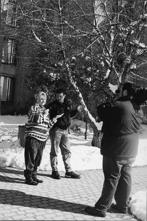 Tree-care specialist Mike Crough explains to reporter Sylvia James how he