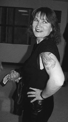Trudy Kirschner of Computing and Telecommunications Services shows off the tattoo that might have been the deciding factor for judge Sybil Thorn in presenting her with the grand prize at the annual Warty Pumpkin Awards on Halloween.