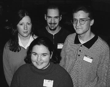 Among some 250 entrance, in-course and international scholarship winners at an Oct. 31 reception in Lady Eaton College Pit are these four top-award holders: Kristen Rudderham (left) and Stephen Sayer (centre), second-year Champlain Scholars; Katy Whitfield, winner of the $10,000 Board of Governors Leadership Scholarship; and Derrick McIntosh, winner (with Meaghan Buisson) of a first-year Champlain Scholarship. Each year, two Champlain Scholars are chosen from a pool of applicants to win $8,000 each in their first year and $2,500 each subsequent year they maintain an A average.