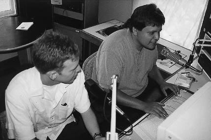 Brendan Edwards (left) trains grad student Keesic Williams in the fine art of radio broadcasting.