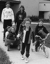 Jonathan pulls a wagon full of fellow preschoolers and Myles rides his bike with teachers Gorica