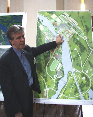 | Architect Barry Sampson describes options for new and future construction on Symons Campus during the Master Plan Update open house on November 8th. The proposed options were selected following extensive face to face consultation. Further feedback from the open house is being used to bring the plan closer to final form. The university community will have an opportunity to comment on a final draft early in December. |
