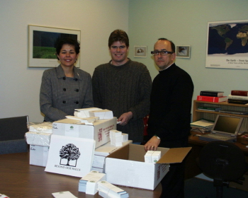 Trent's General Campaign Cabinet has approved a logo for Trent's $17-million campaign, following nearly one year of market research and community consultation. Shown helping unload materials for the "Beyond Our Walls" drive, are Ana Lopes, member of the General Campaign Cabinet and Trent's Board of Governors and chair of Campaign Communications, David Wallbridge, member of the General Campaign Cabinet and President of the Trent Central Students' Association, and Lawrence Finn, logo designer with Lawrence Finn and Associates and a Peterborough native. Campaign leadership gift solicitation and volunteer leadership enlistment continues. The public launch of the campaign is planned for October in Peterborough and Toronto.