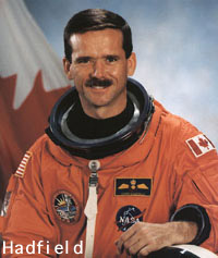 Hadfield, who grew up in Milton, was added in June 1992 to the Canadian astronaut program and selected for mission specialist training at NASA's Johnson Space Centre in Houston, Texas. He served as a mission specialist in November 1995 on NASA's second space shuttle mission to rendezvous and dock with the Russian Space Station Mir during an eight-day flight. He was the first Canadian mission specialist, as well as the first Canadian to operate the Canadarm in orbit and the only Canadian to ever visit Mir. The 39-year-old works as NASA's voice of mission control to shuttles in orbit, and is the chief astronaut for the Canadian Space Agency. His next flight scheduled for next year will deliver and install the new Canadian Robot Arm (Space Station Remote Manipulator System) and three spacewalks are planned, which will make Hadfield the first Canadian ever to leave a spacecraft and float free in space. He has a bachelor degree in mechanical engineering from Royal Military College, Kingston, 1982, and did post-graduate research at University of Waterloo that same year. He did a master of science degree in aviation systems, University of Tennessee, in 1992.