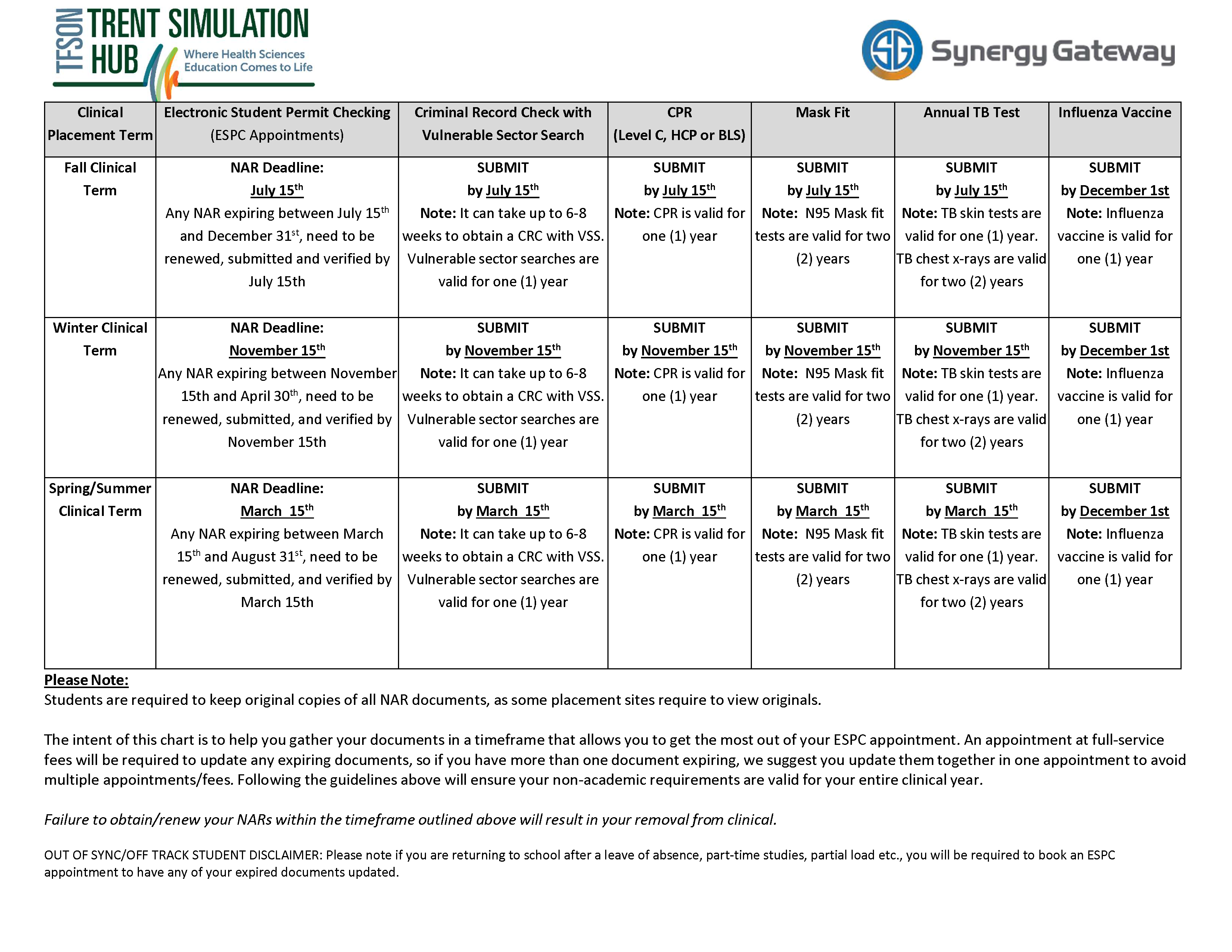 We advise you to book your Synergy appointment after September 1st but well before the NARs Clearance Deadline to ensure you will have time to address any missing items or follow-up actions identified by Synergy during your appointment. Once you have registered for your clinical courses, you will be provided access to the NARs at Trent U blackboard site where further information about Synergy and the submission process can be found.