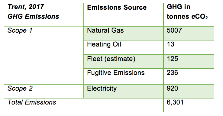 The SO is working to provide more detailed information about Trent's environmental impacts. As we have summary data available, we will post for you. Please see the 2017 GHG inventory below. This is currently an estimate as we wait for emissions factors to be updated for the 2017 year.