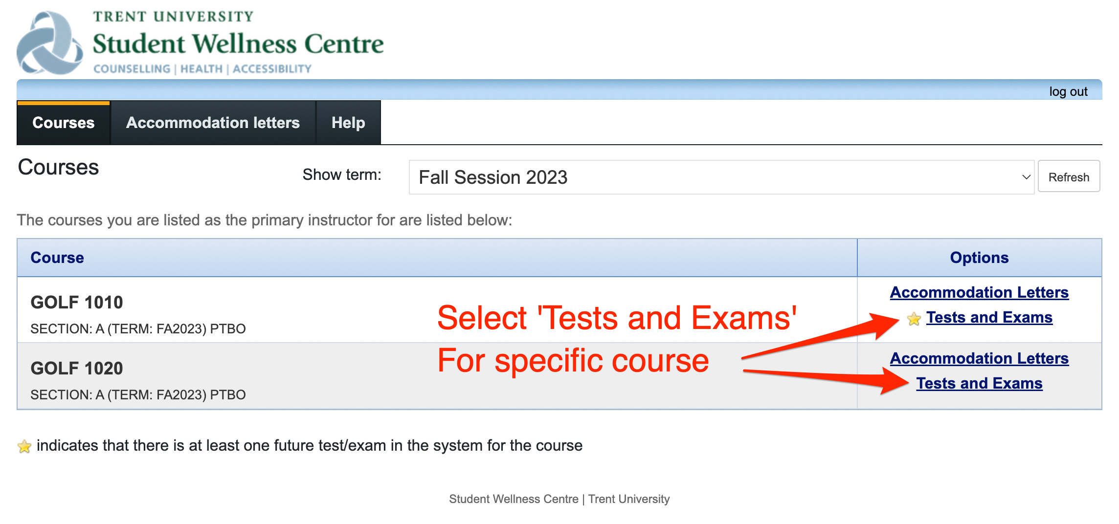 Follow the 'Tests and Exams' link under the 'Options' column to get started!