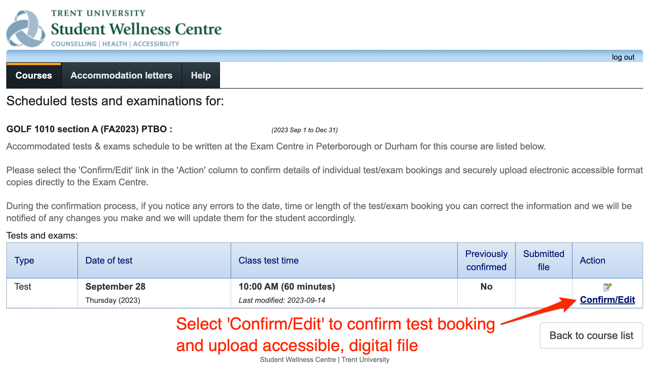 To begin the process of confirming a test or exam and to upload an accessible, electronic copy directly to the Exam Centre, select the 'Confirm / Edit' link from the 'Action' column.