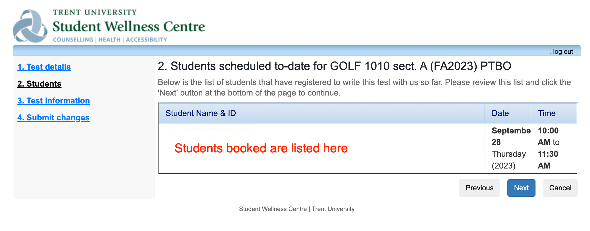 If for accommodation related reasons, you have students writing a final exam on a different date or time from the rest of the class, their information will also be displayed below and a unique exam may be uploaded for their specific testbooking. Details of their exam may be confirmed in subsequent steps.